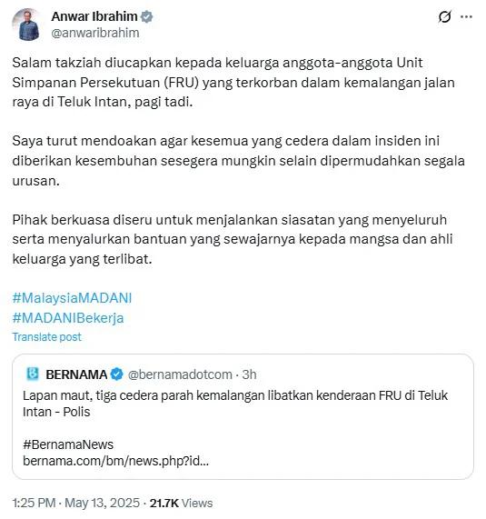安华则在社交媒体发文,对罹难者表示哀悼,并已指示彻查事故起因,确保负责任单位依法处理。