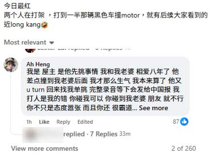 另有一名自称屋主、昵称“Ah Heng”的网友留言指,事因休旅车不耐烦等待其电动门开启,险些撞到其妻子,随后司机掉头回来对骂并引发冲突;他表示将把完整闭路电视画面交给警方及媒体。警方目前正调查事件是否涉及纠纷或其他因素。