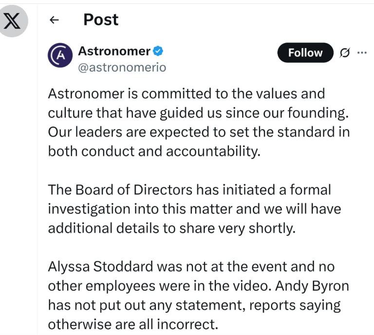 事件曝光后,Astronomer 公司于 7月18日正式发布声明,表示董事会已启动内部调查,并确认安迪与克里斯汀目前已双双停职。
