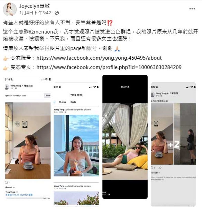 前988电台DJ慧敏(Joycelyn)近日在社群平台发文,指自己照片遭人未经同意散播到不雅群组,让她震惊又愤怒。她表示,是被一名陌生账号艾特(mention)后,才发现照片被流传,事件曝光后迅速引起网友热议与关注。