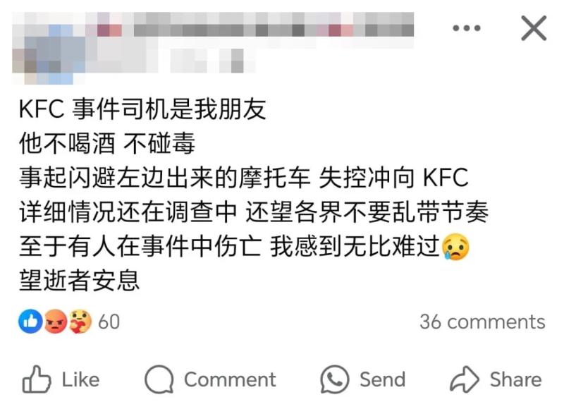事故发生后不久,一名自称是司机朋友的网民在脸书群组发文,强调司机“没喝酒也不碰毒品”,并表示他是为了闪避摩哆才会失控冲向快餐店。他也呼吁大众“别乱带风向”。不过,这篇帖文引发网民激烈批评,并质疑其动机,帖文不到20分钟便被删除。