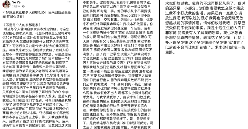 她指出,家中教育较为传统,有时会责骂孩子,是希望他们走正路:“哪个家庭没有打骂孩子?难道非要出事才来教?打骂不代表不爱,更不能用一两次不愉快就定义整段童年。”