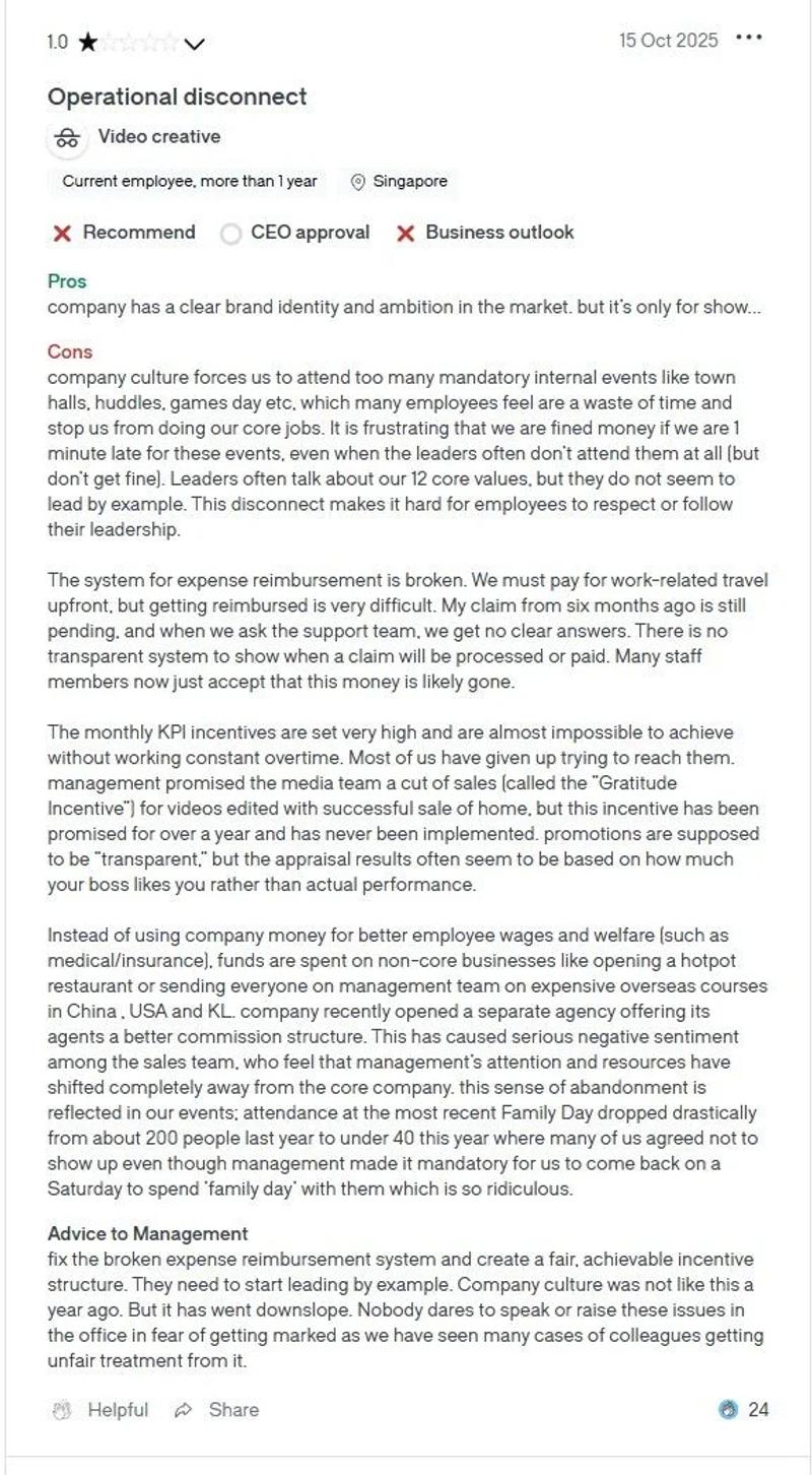 新加坡房地产媒体科技公司 Property Lim Brothers(PLB)在高层绯闻与辞职事件后,再度成为舆论焦点。近期有网民翻出匿名职场评价平台 Glassdoor 上的员工评论,内容直指公司内部管理、文化及晋升制度存在多项问题,引发外界对其企业治理的关注。