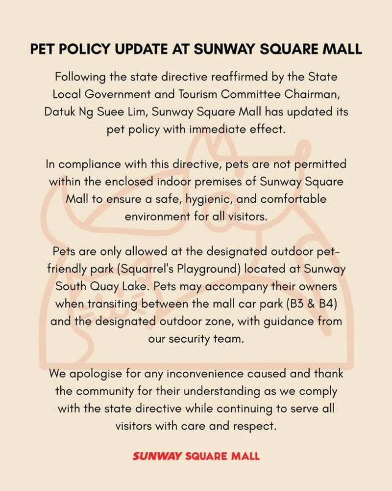 根据 Sunway Square Mall 官方面子书帖文,商场已向雪州行政议员拿督黄瑞林确认,获悉州政府禁止携带宠物进入商场的相关政策,因此决定全面遵守有关指示。文告指出,即日起禁止访客携带宠物进入商场封闭式范围。