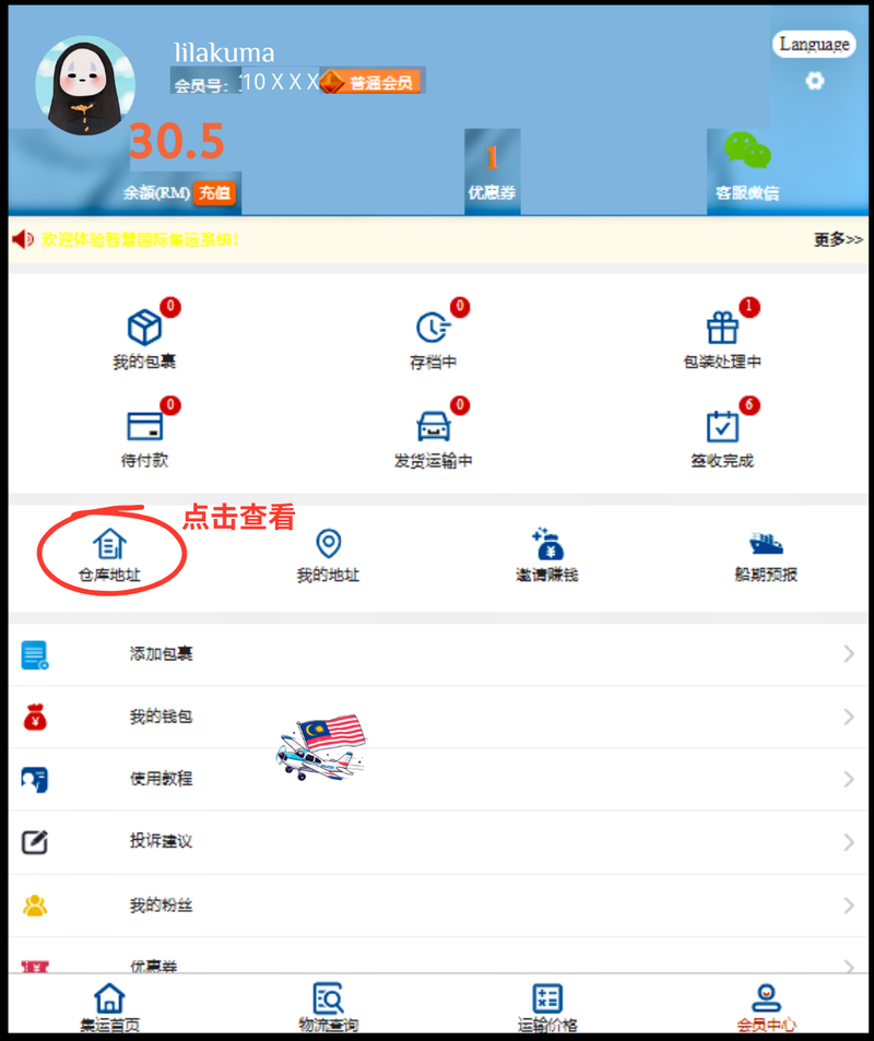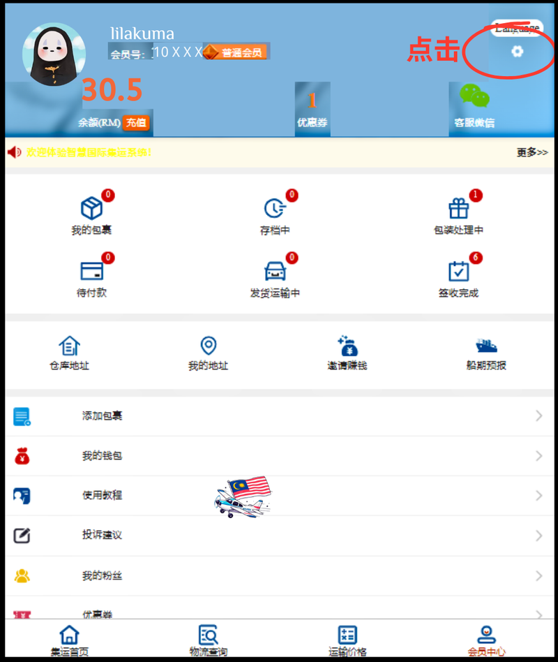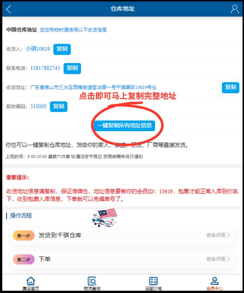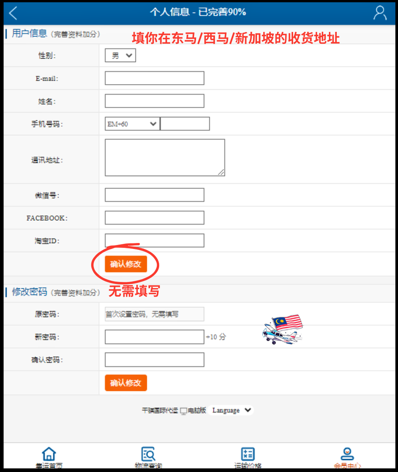 会员中心 - 设置 - 填写【地址,名字,电话号(货到后,会wasap通知你取货)】-确认修改。