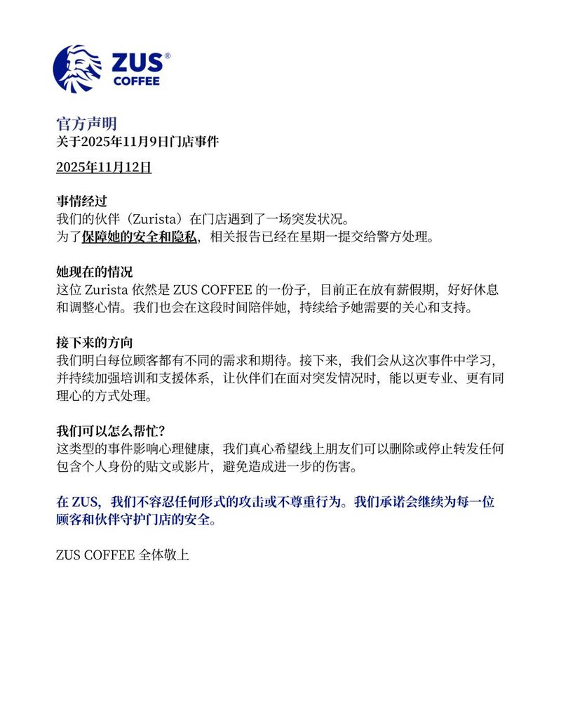 但ZUS Coffee及时发声明、安抚员工、报警应对,