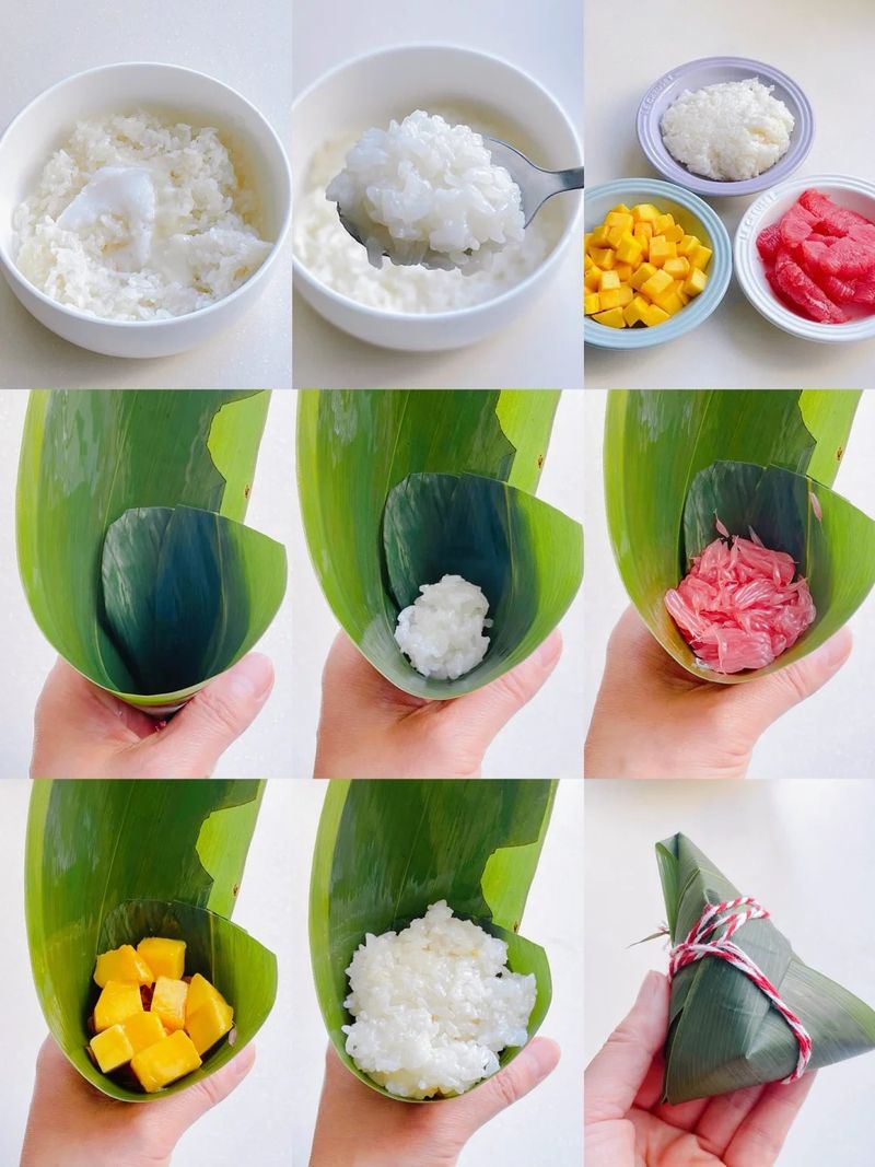 3️⃣包粽子依次放入糯米饭,西柚(西柚碎加入少许蜂蜜搅拌均匀不易散),芒果丁,糯米饭,绑扎结实,放入冰箱冷藏定型就好啦 。