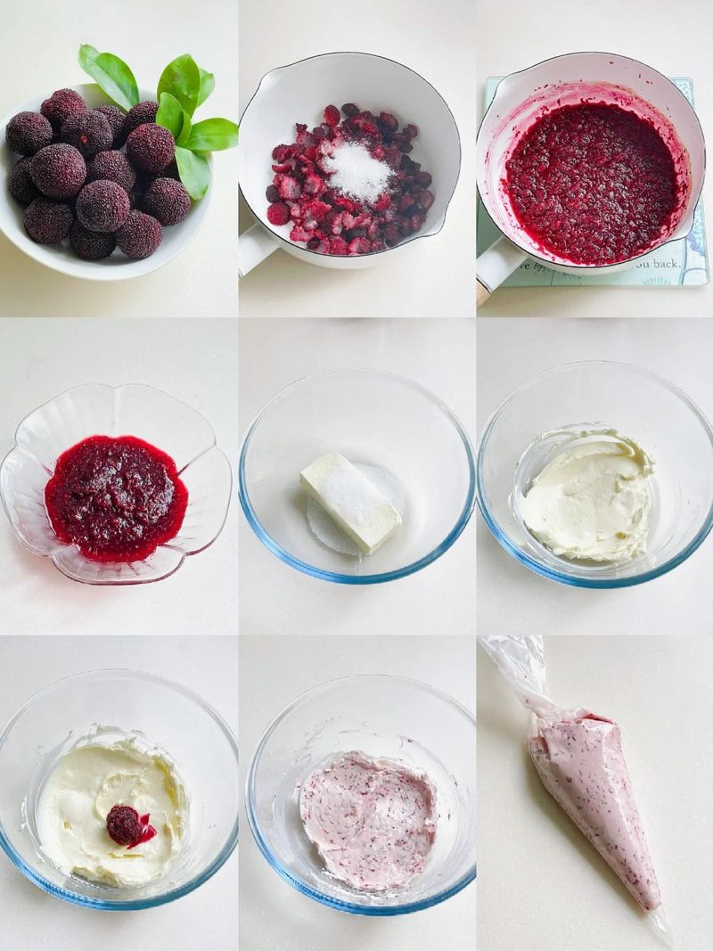 加入杨梅酱15克,搅拌均匀做出杨梅乳酪,装入裱花袋备用