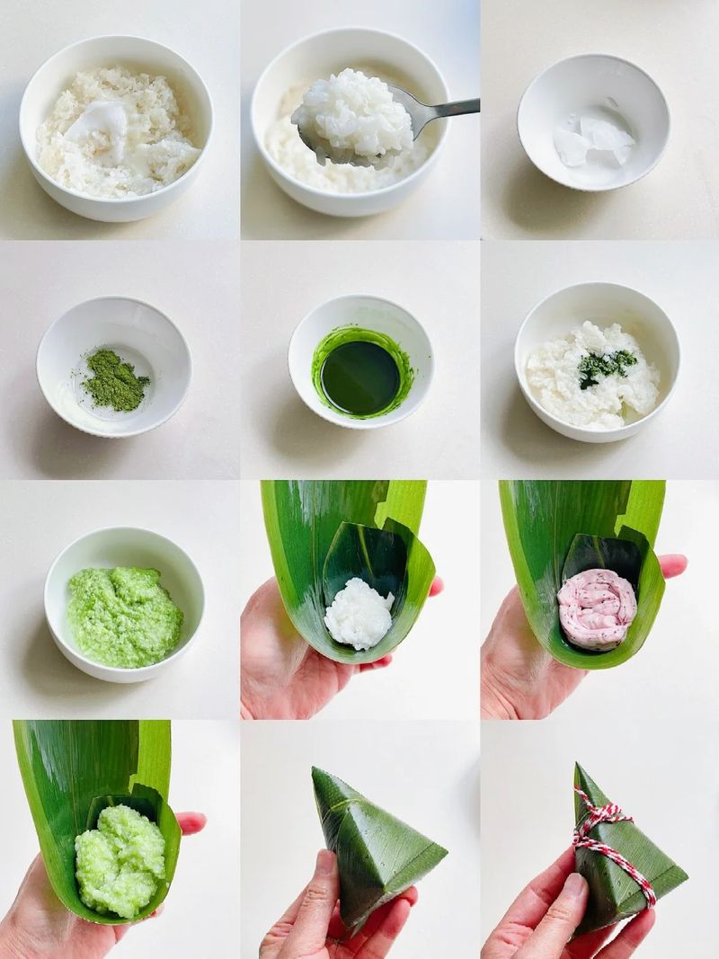 3️⃣包粽子依次放入糯米饭,裱花袋挤入杨梅乳酪,再放入抹茶糯米饭,绑扎结实,放入冰箱冷藏定型就好啦