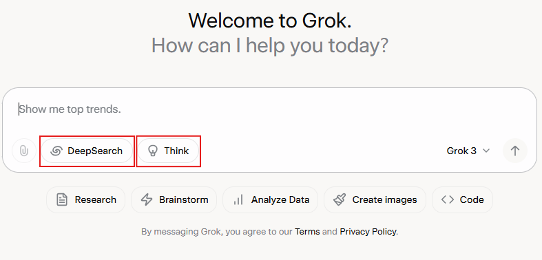 在 Grok3 的界面上,你将看到两个主要操作按钮:“DeepSearch”与“Think”。