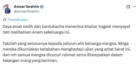 首相拿督斯里安华对这起悲剧表达深切哀悼,并在社交平台X发文慰问家属:
