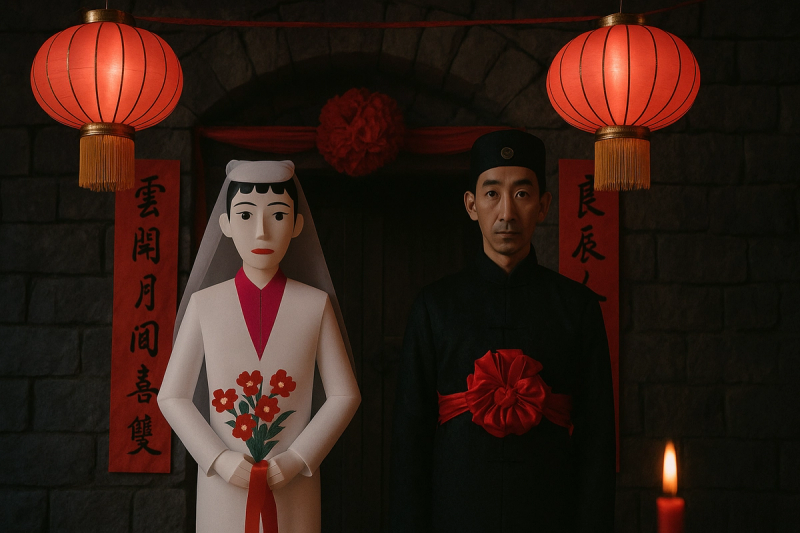 今日的冥婚仪式与传统婚礼惊人相似。家人为逝者挑选配偶,考虑年龄、家庭背景及星象匹配,风水师常担任“鬼媒人”,确保婚姻吉利。女方家庭会要求礼金,并提供纸扎嫁妆,如珠宝、仆人甚至豪宅,这些物品象征阴间生活的必需品。仪式包括拜天地、设灵位,甚至举办宴席邀请亲友。仪式的高潮是将女方遗骨挖出,与男方合葬于家族墓地。在台湾,“娶神主”则无需挖骨,生者可再婚,但需尊逝者为“正妻”。这些仪式不仅反映了对逝者的尊重,也体现了家族对阴间幸福的期盼。