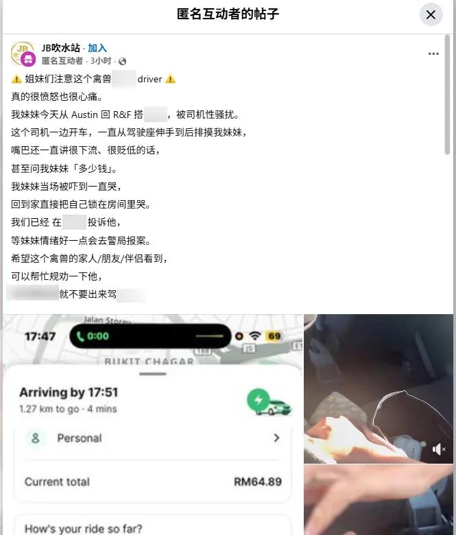 从视频画面可见,司机在驾驶过程中多次把手伸向后座触碰女乘客,并说出带有侮辱与不当暗示的言语。司机先询问女子是否会说中文,随后不断试图接触对方;另一段视频中,更直接询问“多少(钱)”等不当问题。事主家属今日傍晚以匿名方式,将视频及司机资料上载至面子书专页“JB吹水站”,并说明事发地点为从新山茂奥斯汀前往富力公主湾(R&F)的行程。