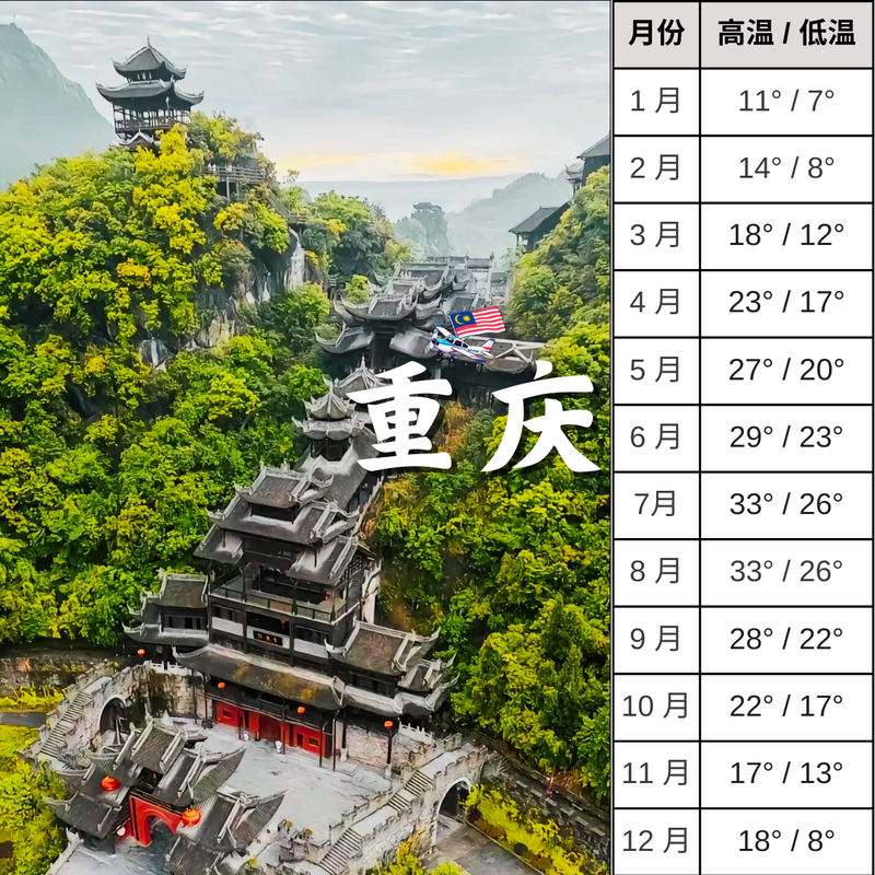 3-5月 和 9-10月是重庆的最佳旅游时间。因重庆属亚热带季风性湿润气候,这两时段是重庆的春秋季,气温最为舒适,不冷不热。