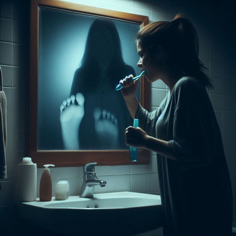 那天晚上,我站在浴室的洗手盆前刷牙洗脸。镜子里昏黄的灯光映出我有些疲惫的脸。当我微微抬头时,余光中突然瞥见背后有一双男生的脚,灰白的脚背,隐约透着青紫。我的心猛地一沉,呼吸停滞,冷汗顺着额头滑落。
