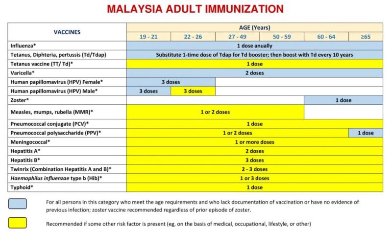 在马来西亚,国家免疫计划成年人应及时接种流感和 Tdap 等基本疫苗。这些疫苗可通过诊所轻松获得,可以有效预防严重疾病。