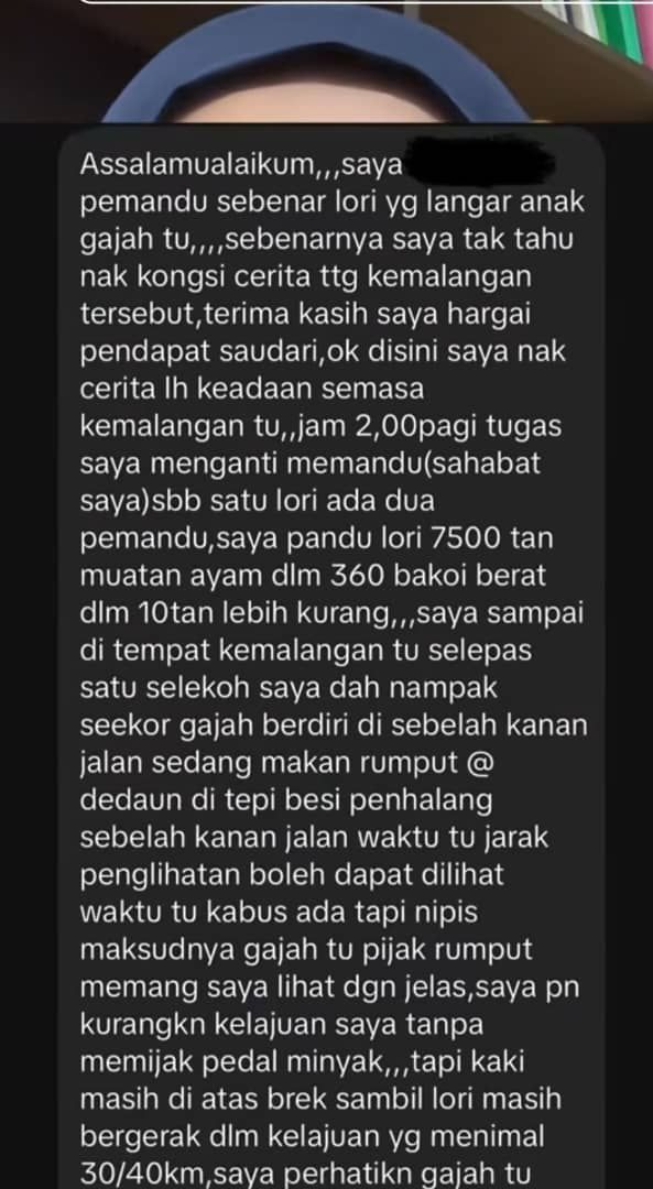 小象遭罗里撞毙事件引起全国关注,母象伤心守护幼崽遗体一夜的画面感动无数民众。如今,一名疑似涉事的罗里司机透过TikTok用户“Kakak Raptor”代为发声,首次公开讲述事发经过,并向全体马来西亚人民郑重道歉。