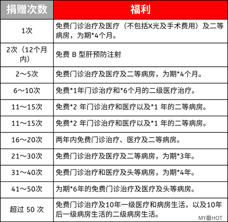 马来西亚卫生部根据 KPK 通函 制定的医疗机构(医院、机构和诊所)马来西亚捐血福利表。