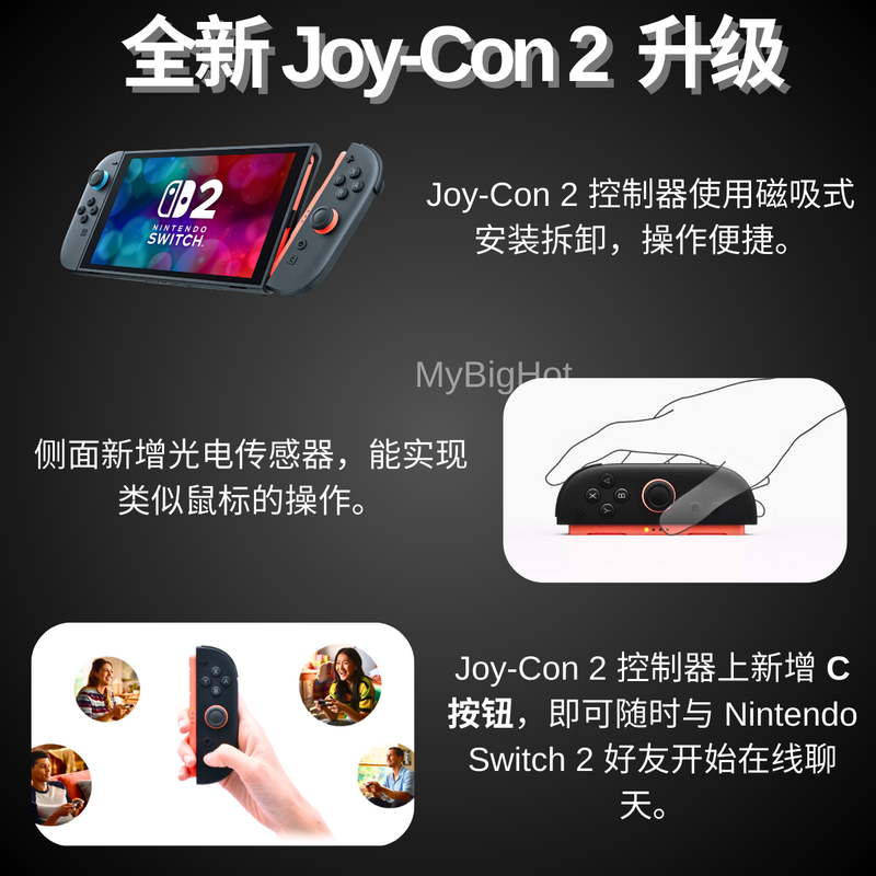 Joy-Con手柄尺寸加大,改成磁吸式安装拆卸,操作便捷。侧面新增光电传感器,能实现类似鼠标的操作。摇杆升级为霍尔摇杆,精准度更高,有望解决一代手柄漂移问题。