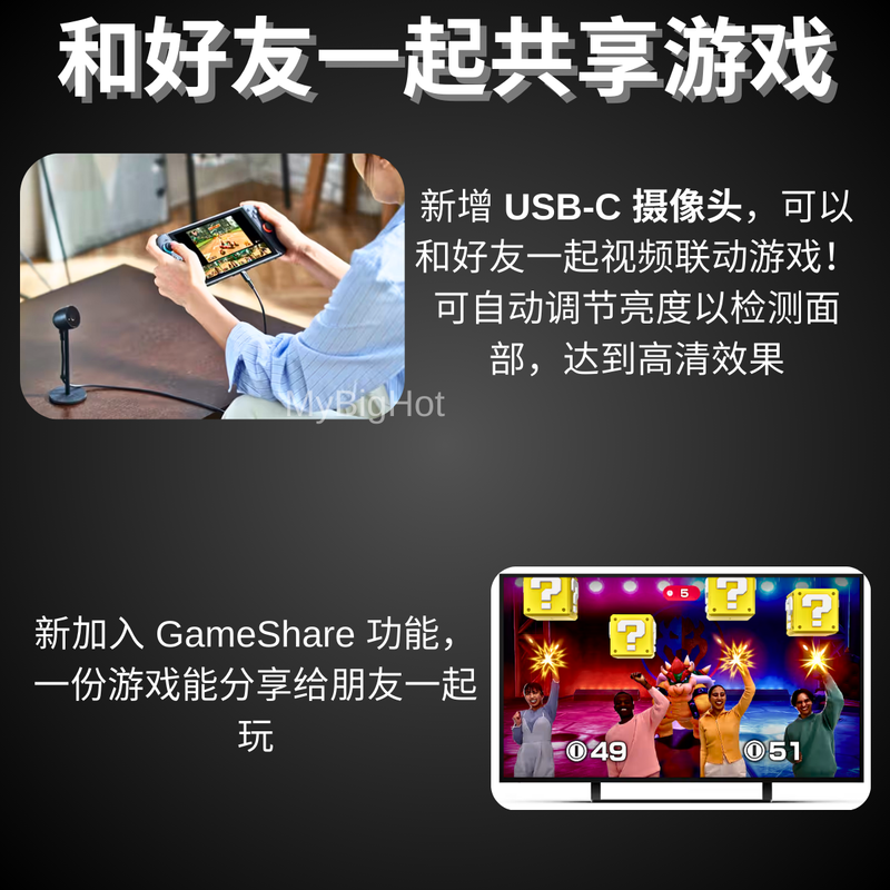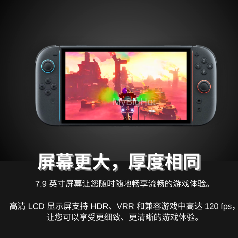Switch 2 屏幕增至 7.9 英寸。相比Switch OLED屏幕,显示面积提升30%,对比初代,屏幕显示面积提升 66%。大屏幕让游戏视野更广阔,画面更清晰,游戏沉浸感更强。