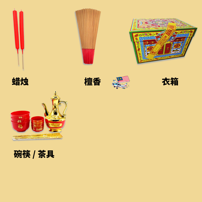 *香爐前摆放以三碗饭 , 三盘菜, 三杯茶/酒 為基本的祭品擺放