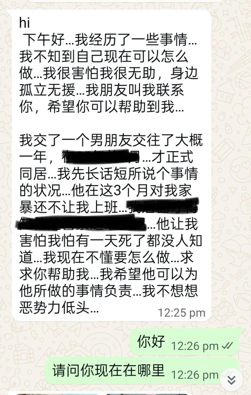 由于与家人疏远、朋友不多,女事主趁男友不在家时,通过WhatsApp向马华新山市议员陈珊珊求助。陈珊珊随即要求她前往警局会合,并陪同她报警及到医院验伤。陈珊珊也在面子书分享事件,呼吁正遭受家暴的女性勇敢站出来自救。