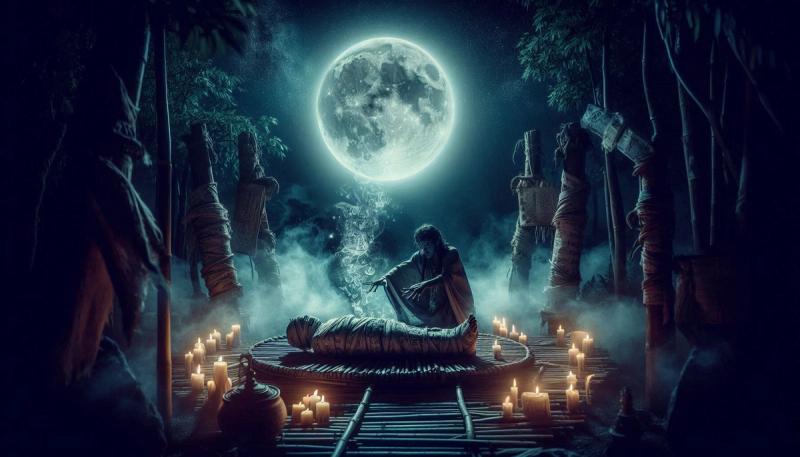 在无尽的悲痛与复仇欲望驱使下,丈夫寻得一名掌握还魂术的法师。法师告知,只要将庞蒂娜与孩子的遗体以写满咒语的裹尸布严密包裹,并在竹架搭成的平台上连续七天七夜施行复活法术,就有可能使她重返人间。不过,法师也曾警告:从地狱归来的魂灵,若无某种特殊物品牵制,便难以在阳间长存。尽管如此,丈夫仍不顾一切,执意让法师冒险施法,为的只是那份深沉的恨意。