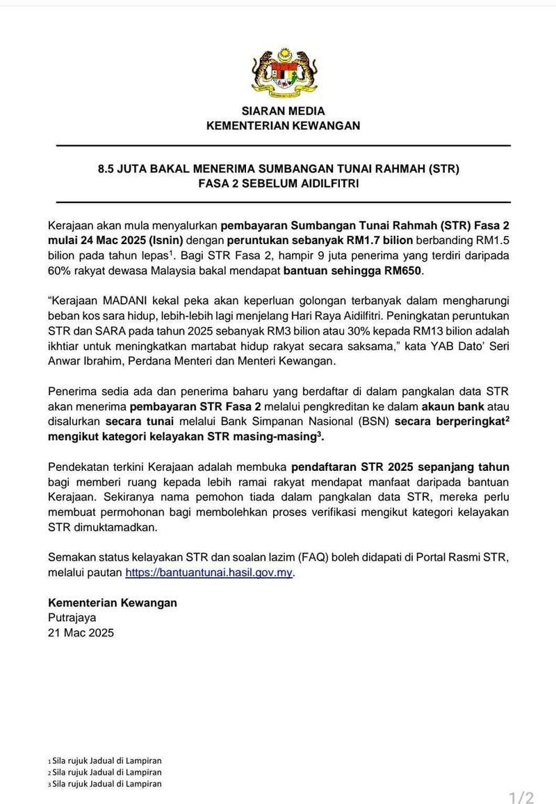 财政部将在 2025 年开斋节之前(2025 年 3 月 24 日)支付第二阶段慰问现金捐款 (STR)。