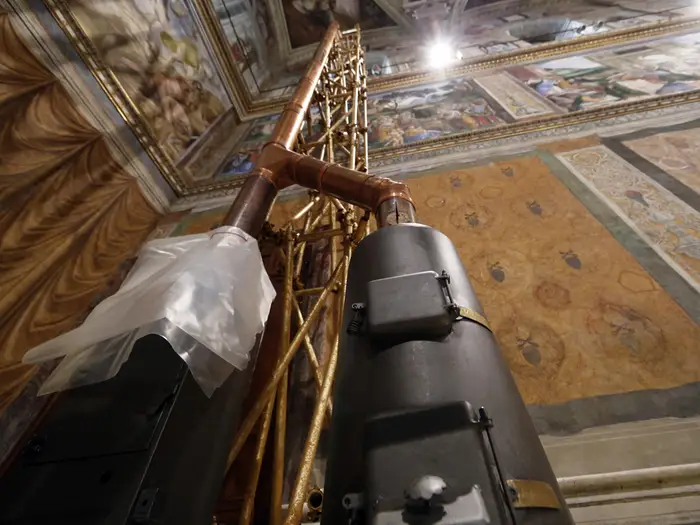 烟雾通过西斯廷教堂屋顶的专用烟囱排放。这一烟囱连接两个炉子:一个用于焚烧选票,另一个通过电子点火装置引燃信号弹,产生不同颜色的烟雾。两个炉子共用一条铜制烟道,确保烟雾顺利排出。据鲍姆加特纳记载,外部烟囱的设置相对较晚,直到18世纪才被引入。在此之前,烟雾直接在教堂内散开,难以形成明确的外部信号。如今的烟囱设计既实用又具象征意义,成为仪式不可或缺的一部分。