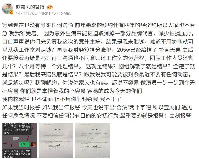 赵露思表示,自己去年因身体问题,无奈暂停代言与拍摄工作,产生约205万元人民币赔偿责任。她原以为公司会协助处理,没想到却被反咬一口,不仅不承担,还**“直接从她工作室划走800多万”**,甚至诱骗她财务人员签下分账同意书。